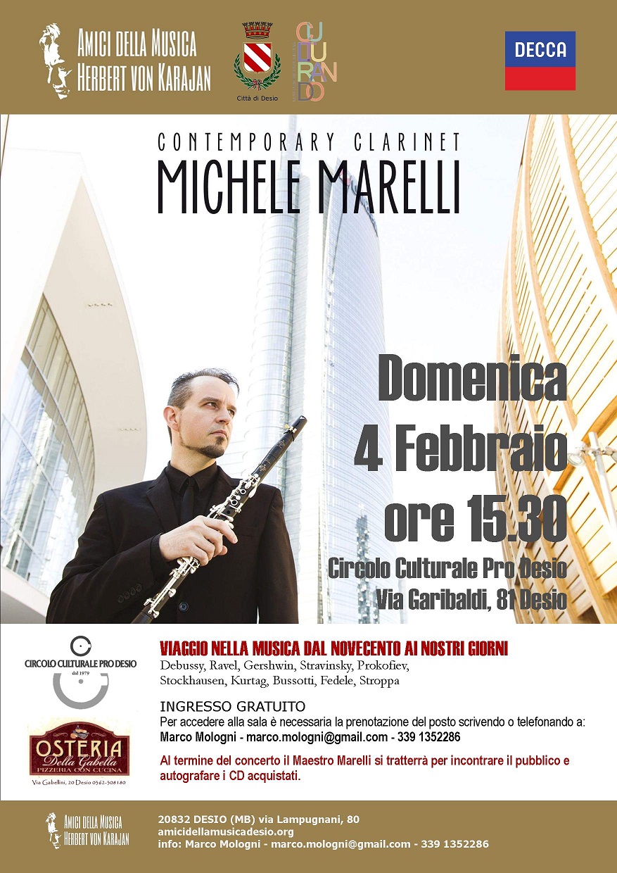 domenica 4 febbraio alle 15.30 al Circolo Culturale Pro Desio (via Garibaldi, 81, Desio) vi offriamo la possibilità di incontrare da vicino e di ascoltare un grande artista: MICHELE MARELLI. Ad appena 39 anni, Marelli è uno dei più importanti clarinettisti del mondo. Il suo talento straordinario gli ha permesso di lavorare insieme ai più grandi compositori di oggi: Karl Heinz Stockhusen, Gyorgy Kurtag, Sylvano Bussotti, Ivan Fedele.